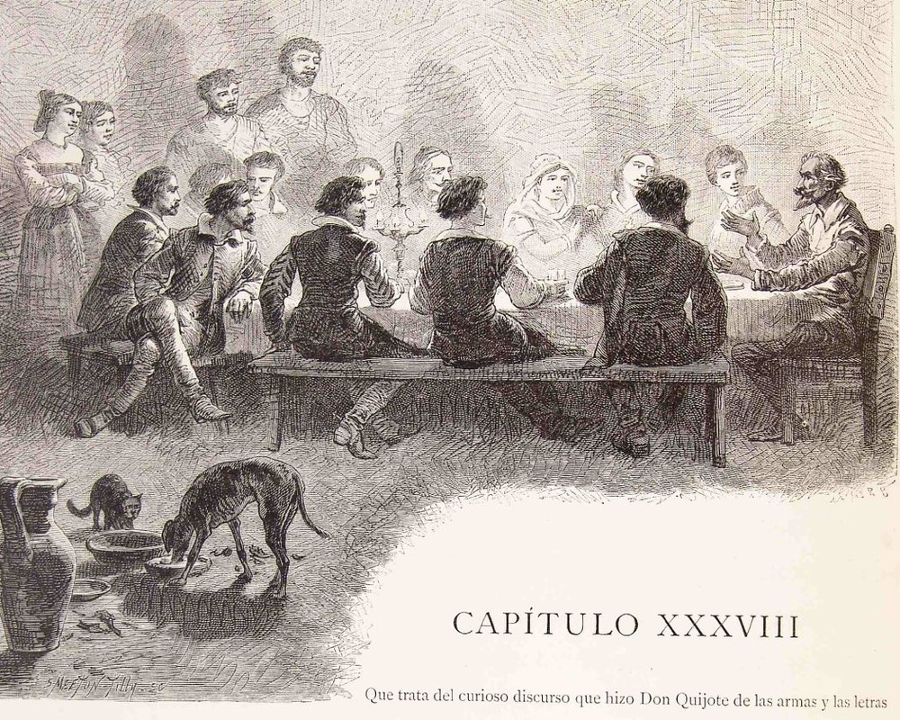 El discurso de las armas y las letras es el drama de la baja nobleza. De los hombres que se quedaron con un pie en la Edad Media y con otro en el Renacimiento. De los hidalgos e infanzones que contemplaron cómo sus lorigas y espadas se empolvaban en un rincón. Al mismo tiempo, bajo el reinado de Felipe II (1556-1598), España vivió su periodo de mayor poder y riqueza. Con el expansionismo a puje, fue necesario consolidar, por un lado, un ejército profesional y permanente; por el otro, una burocracia. Así, la nueva administración, más que guerreros nostálgicos, requirió escribanos, secretarios, jueces y abogados; más que un código caballeresco, priorizó la técnica y la disciplina. Pocos nobles pudieron solventar sus estudios en letras, el resto encontró en las armas un remoto refugio del honor.